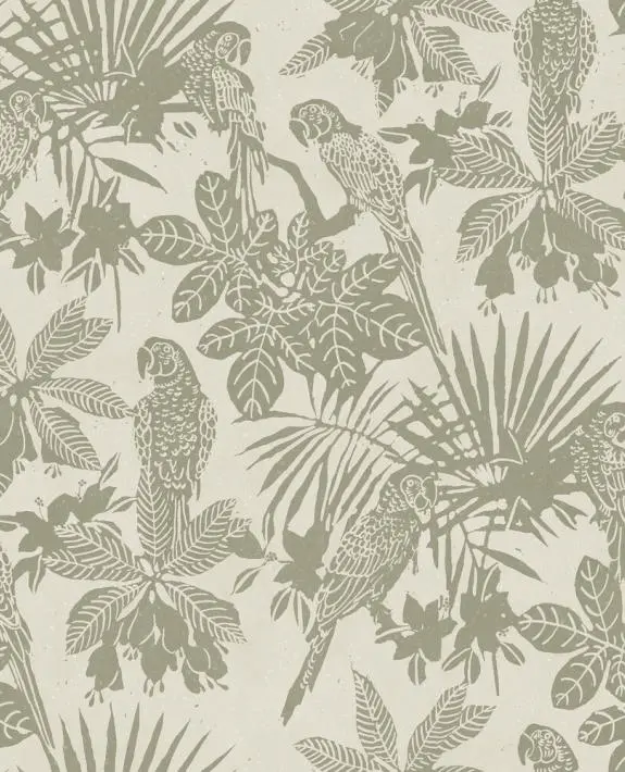 Een mooie sbetoverende mural van Borastapeter. Het behang Parrot is een handgetekend, exotisch behang met bladeren en papegaaien. Het patroon heeft een gedrukte structuur van oud papier om de prachtige details van het patroon te versterken. Creëer rust en harmonie met Parrot in wit- en groentinten.