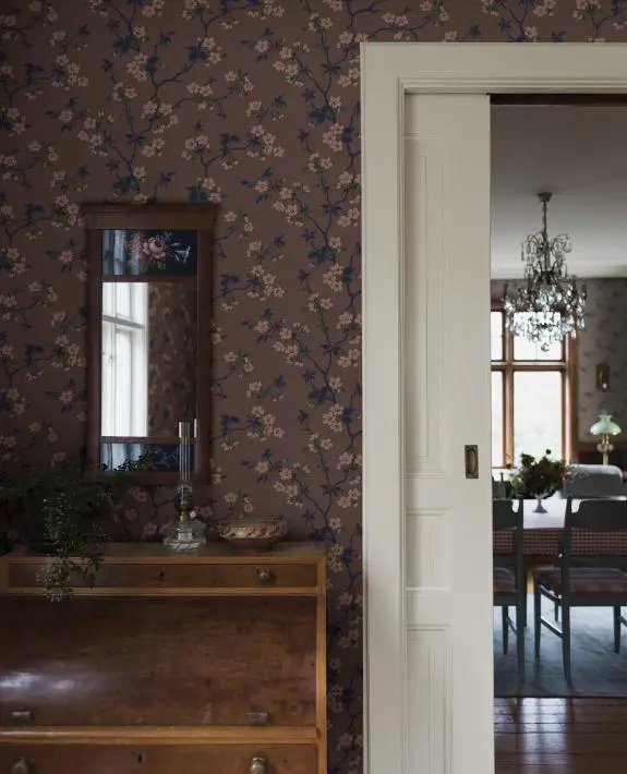 Het Trädgårdsstaden behang van Borastapeter biedt een rustige en klassieke stijl. Het doet denken aan de schoonheid en magie van een Japanse lente, het kersenbloesempatroon uit de jaren 1920 danst over de muren voor een lichte en heldere esthetiek.