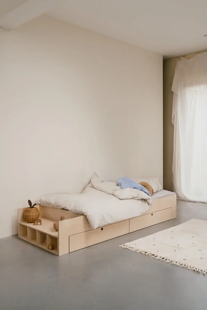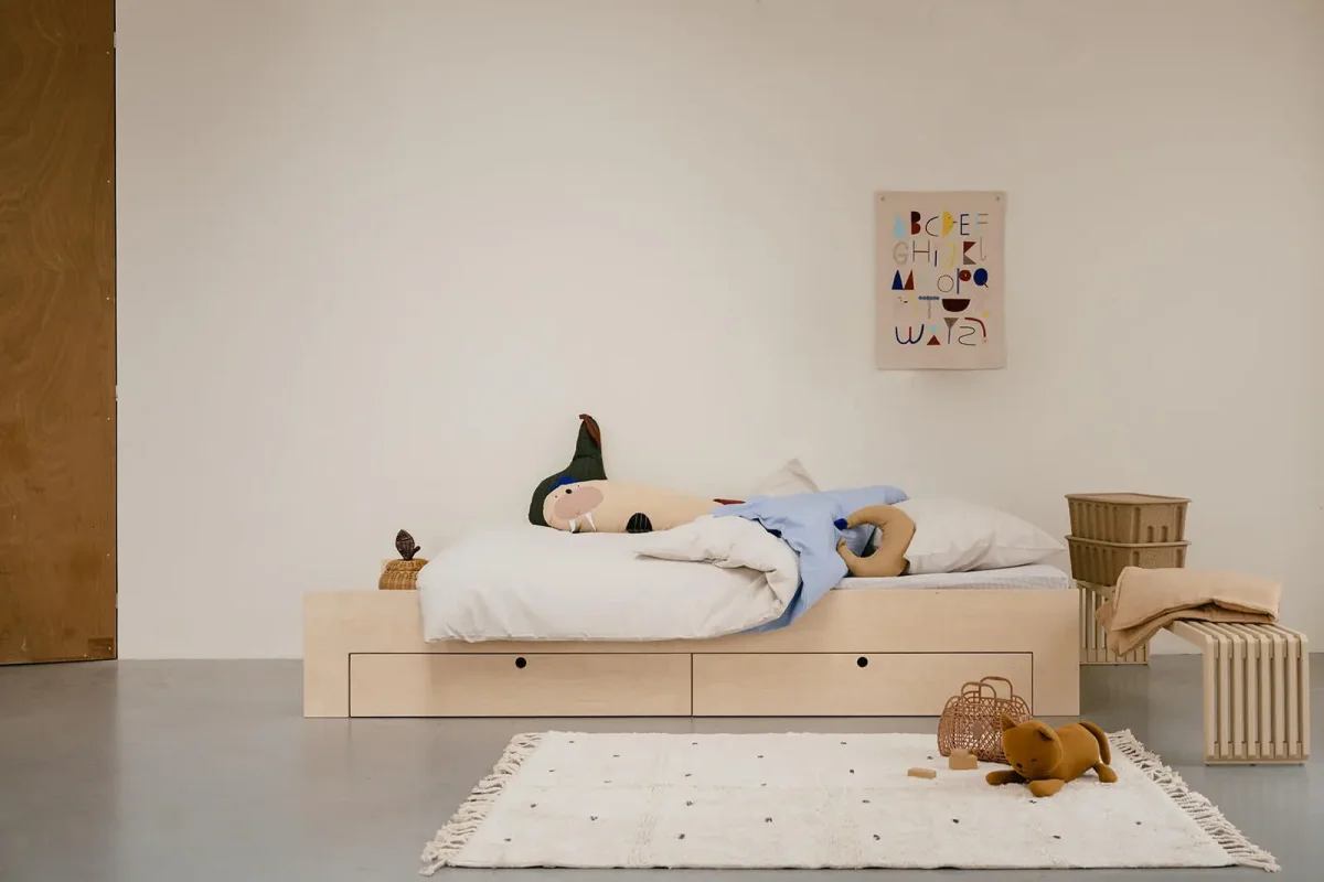 Het bed wordt geleverd inclusief lattenbodem, een matras wordt niet meegeleverd en is optioneel bij te bestellen. De lades hebben wieltjes waardoor ze eenvoudig onder het bed vandaan gehaald kunnen worden. Het bed wordt gemaakt van FSC gekeurd esdoorn multiplex, deze wordt uitvoerig geschuurd waardoor het glad aan voelt.