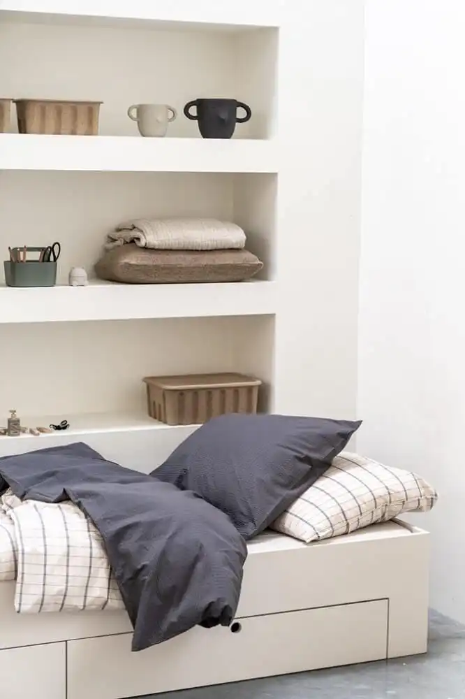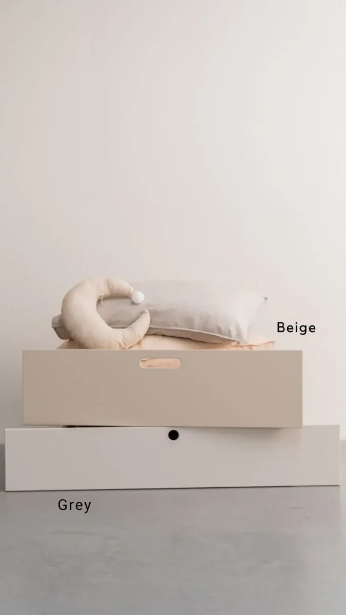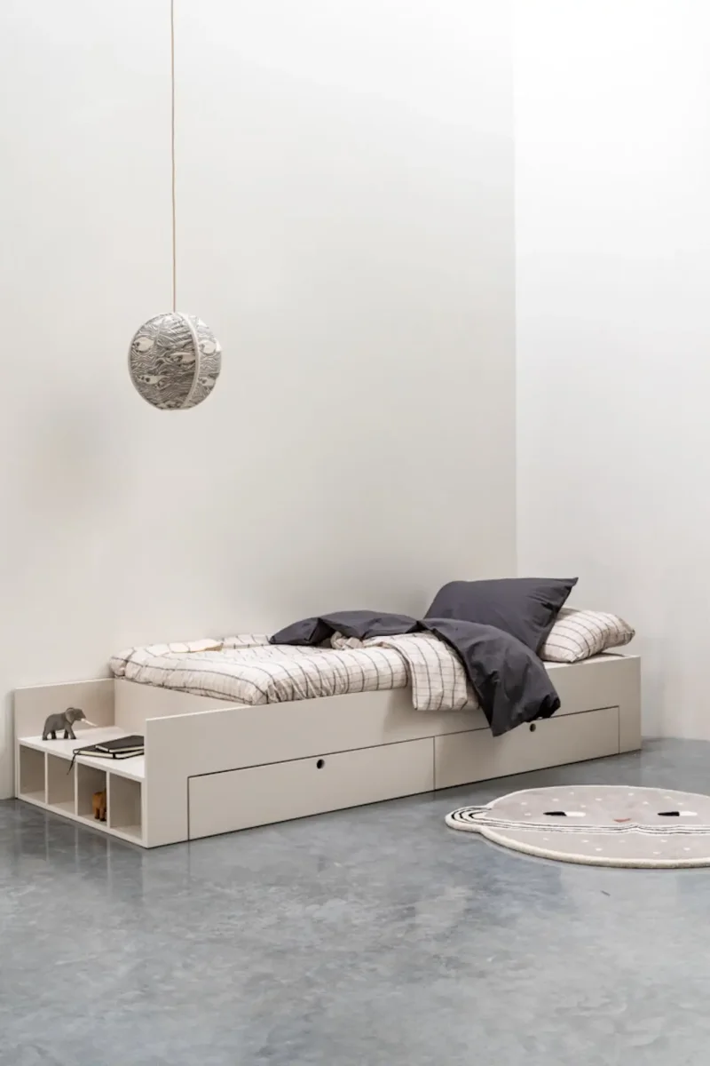 Het bed wordt gemaakt van PEFC gekeurd MDF. Het wordt materiaal wordt glad geschuurd en daarna wordt het behandeld in onze eigen spuitcabine met een hoogwaardige lak waardoor het resultaat super strak oogt. De kleur is speciaal voor ons ontwikkeld en heeft een warme rustige tint, tijdloos zodat deze jaren mee gaat en overal bij past! Daarnaast is de watergedragen lak makkelijk afneembaar én beschermt het bed tegen krassen en deukjes. Deze lak is uitvoerig getest en voldoet aan strenge eisen.