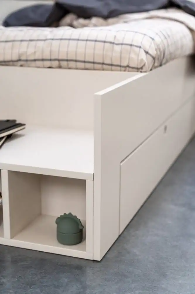 Bed Koen is een heerlijk stoer bed met handige opberglades en een bankje om heerlijk te zitten of de mooiste spulletjes neer te zetten. Ook kan het bankje gebruikt worden om het bed in te stappen. Het bankje is aan beide zijkanten van het bed te plaatsen. De lades zijn voorzien van wielen waardoor de lades makkelijk onder het bed vandaan gehaald kunnen worden.