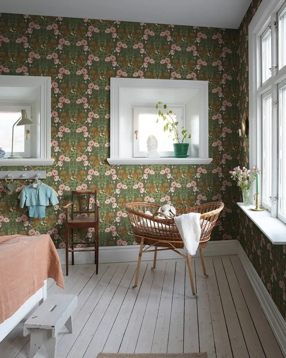 Met het behang Kurre van Midbec Tapeter heeft lieve eekhoorntjes die de wand versieren en geeft een romantische, zachte sfeer aan de kamer.