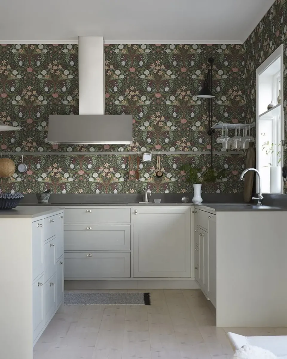 Het behang Frösö van Midbec Tapeter is een patroon gevuld met bloemen. Een levendig lentepatroon met een neutrale kleurkeuze waarbij groen en natuur onderdeel worden van je kamer. Een bloemenbehang dat net zo mooi staat in de eetkamer, slaapkamer, woonkamer als in je hal.