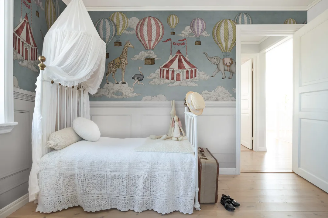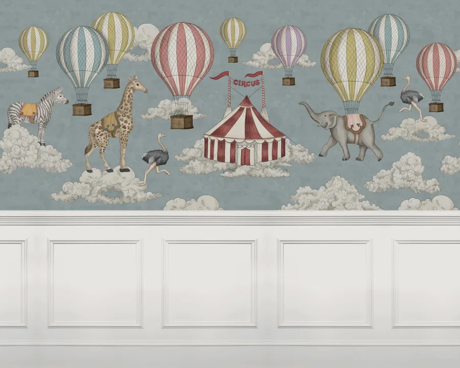 Circus Horizon Panel is een schattig handgeschilderd ontwerp met panelen  ontworpen door Rebel Walls in samenwerking met Jack Kinsey. Het speelse motief bestaat uit dromerige wolken, een circustent, wilde dieren en kleurrijke luchtballonnen boven witte panelen. De perfecte match voor elke kinderkamer of waar dan ook! Deze kleurstelling heeft een rode circustent en zachtgele, blauwe en paarse ballonnen op een blauwe achtergrond met witte wolken.