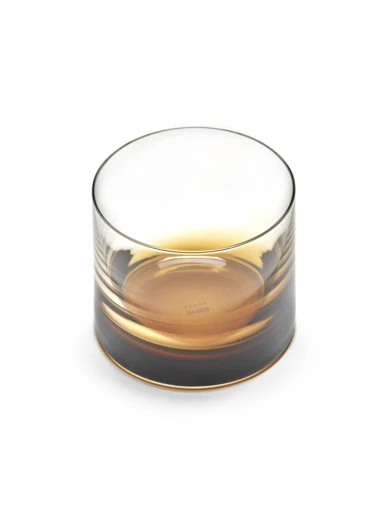 Als aanvulling op het porseleinen servies, ontwikkelde Kelly Wearstler glaswerk dat is gebaseerd op ambertinten die te vinden zijn in oud glas van over de hele wereld. Het unieke kleurverloop wordt verkregen door 3 lagen glas: tussen twee lagen transparant glas wordt de amberkleurige massa gespoten. De lichte en luchtige kleur contrasteert mooi met de opvallend dikke glasbodem en strenge rechte vorm van deze tumbler glazen.